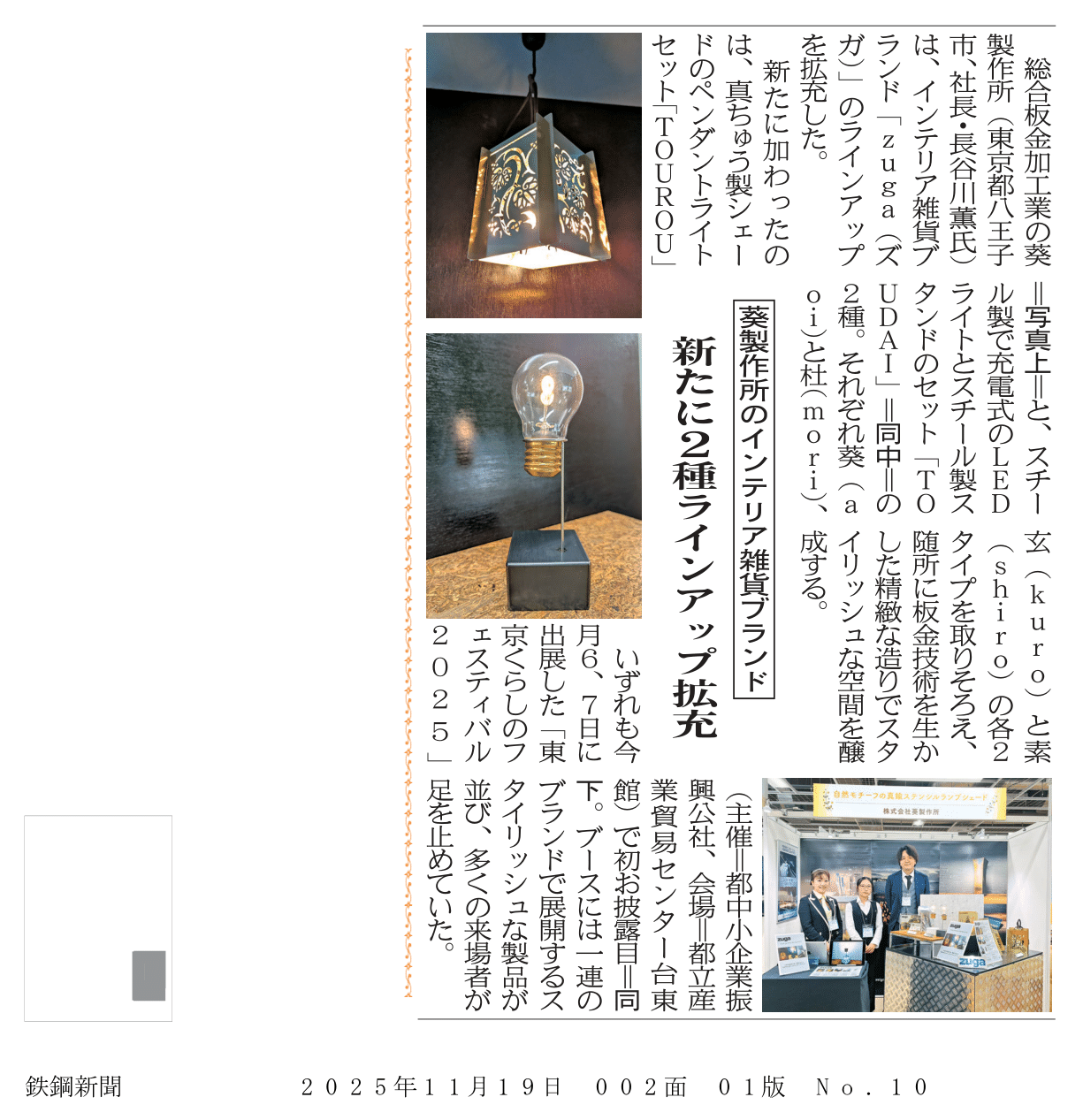 2025.11.19 日刊鉄鋼新聞に「葵製作所のインテリア雑貨ブランド~新たに2種ラインアップ拡充~」と題して、弊社記事が掲載されました。